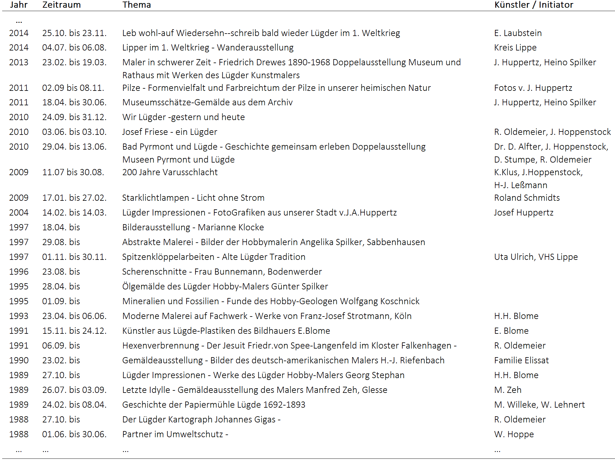 Die Aufstellung gibt einen Überblick über die bis dato gezeigten Sonderausstellungen.